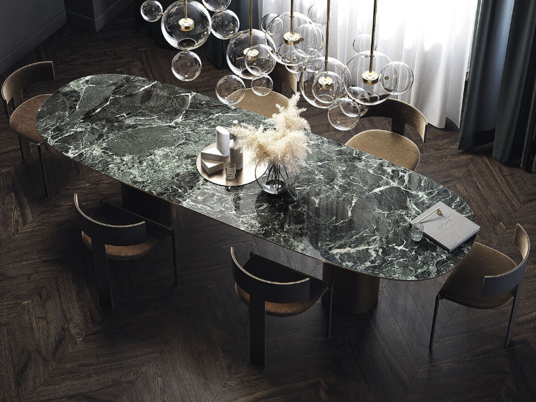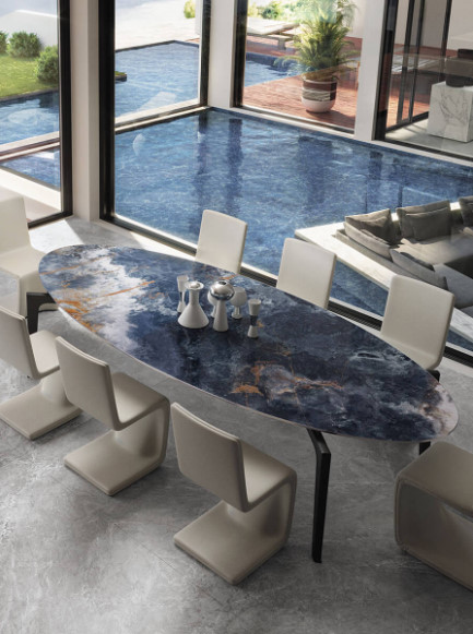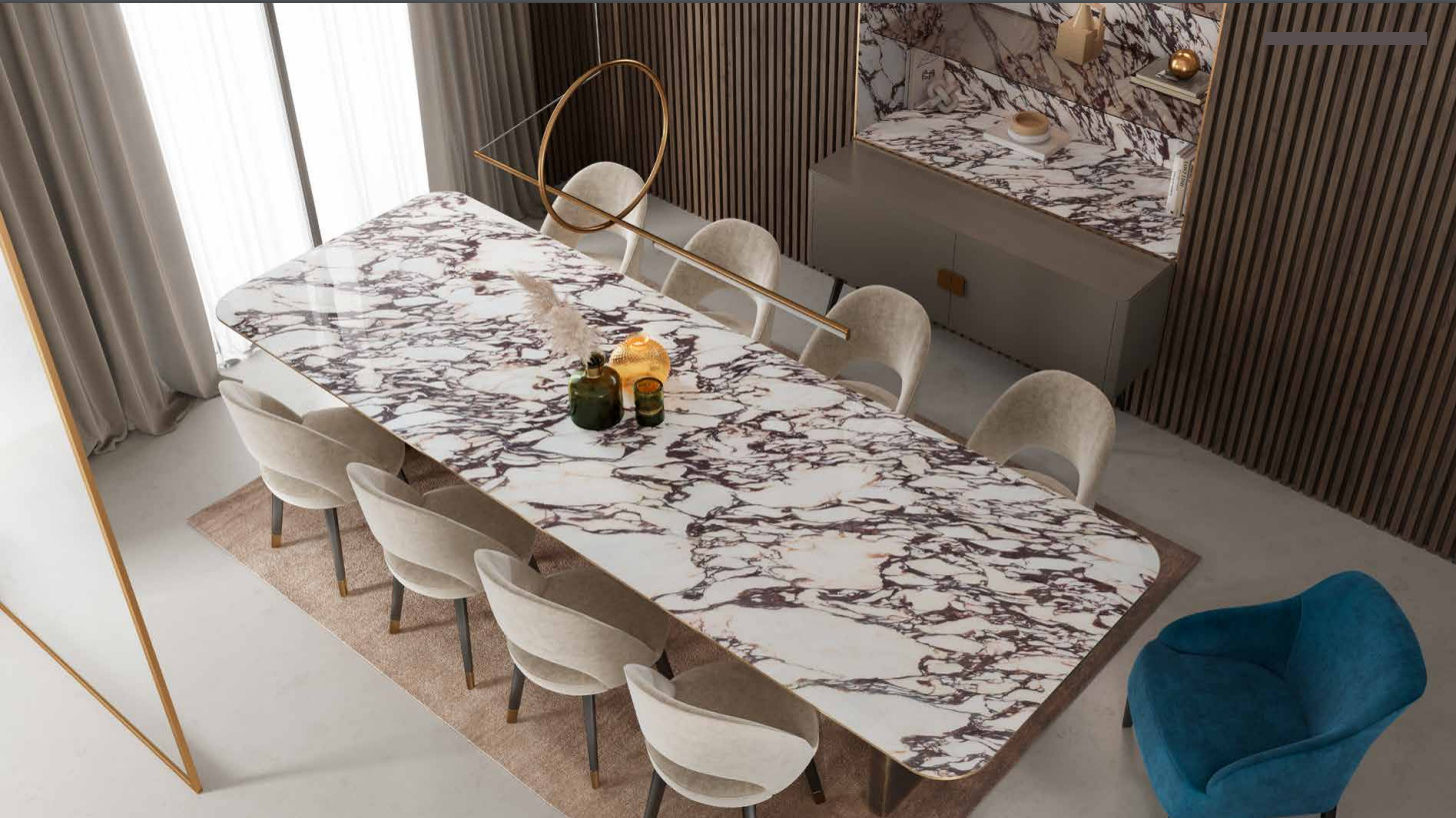 Die Tischplatte aus Keramik ist kratzfest und pflegeleicht.
